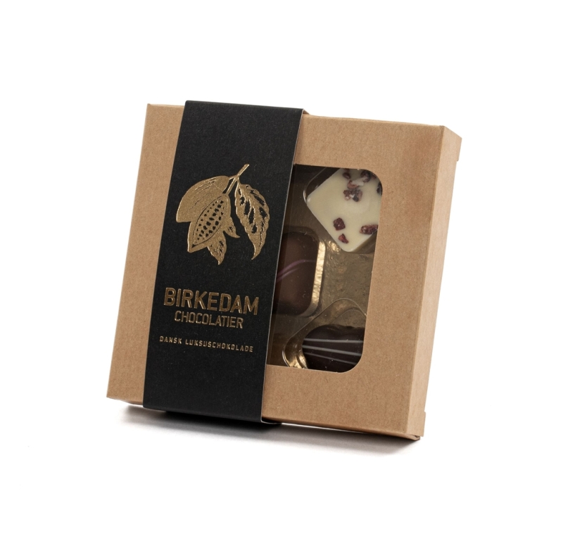 - Fin æske med 5 stk. delikate, dansk producerede chokolader, som passer perfekt i gavekurven.