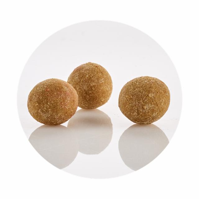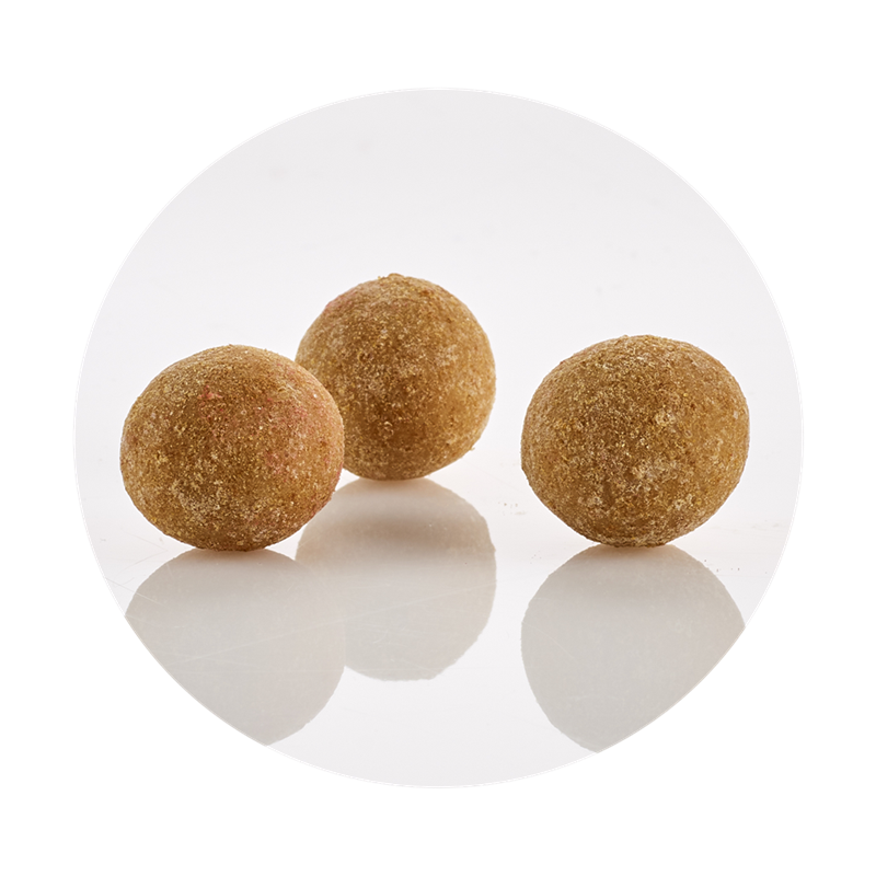 - Lakridskugle, hvor kernen er lakrids overtrukket med lys chokolade og rullet i mild lakridspulver. Hver kugle vejer 6,5 gram.