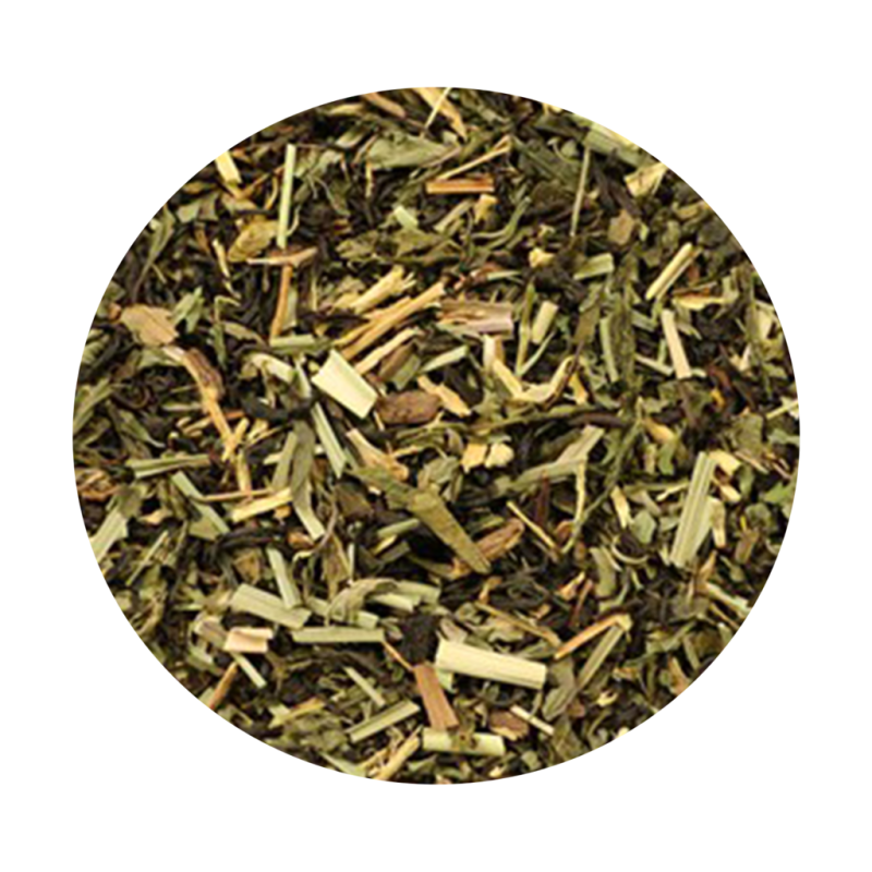 Sort te* (49%), grøn te* (18%), skåret lakridsrod*, Pebermynte*, citrongræs*, naturlig aroma og morgenfrueblomster*. *=økologisk. Indeholder lakrids.