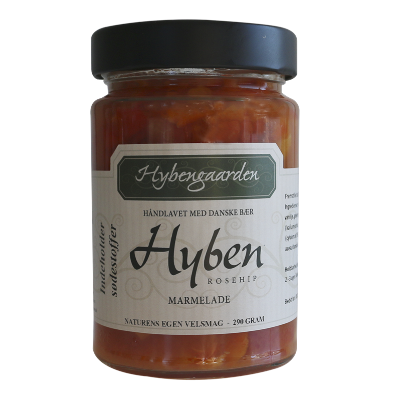 - Skøn og velsmagende marmelade, rig på sommerminder. Tilsat lidt citronsaft og nænsomt tilberedt. Alle hyben er dyrket på egne marker eller andre danske arealer.