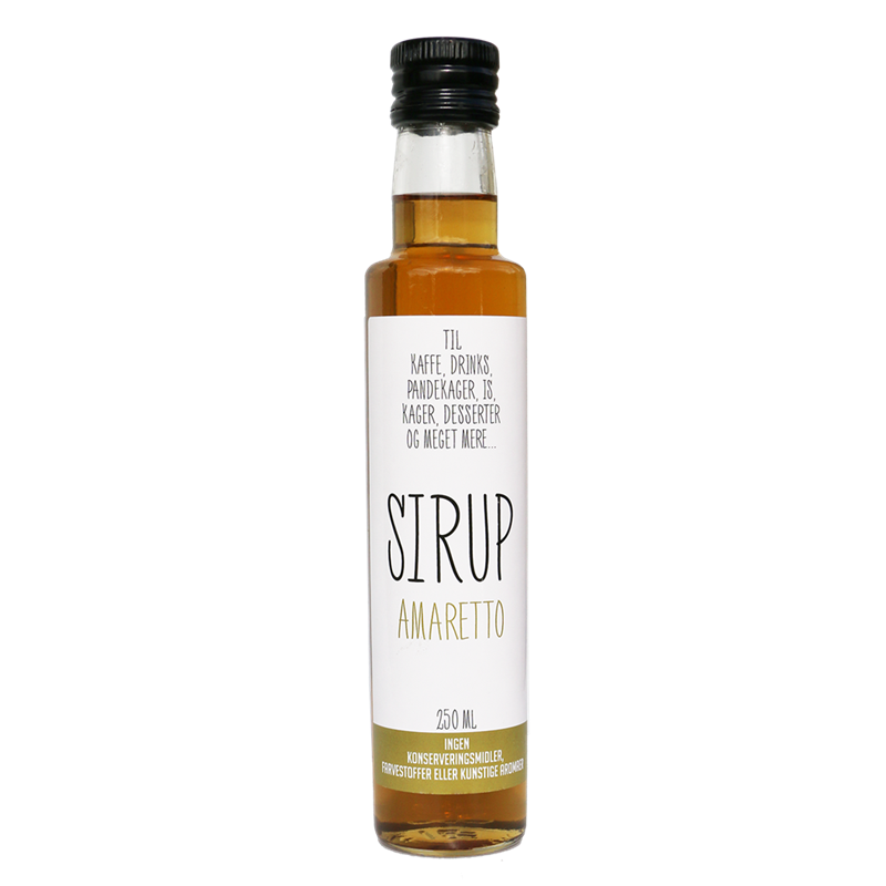 - Denne sirup ameretto giver kaffen et blødt pift af mandel og giver mange muligheder for at prøve mange spændende kaffedrikke af derhjemme. Duften af siruppen leder tankerne hen på den italienske likør med samme navn. Prøv også at bruge sirup ameretto til f.eks drinks, cocktails eller sammen med vanilje til skønne desserter. Ligesom vi ikke går på kompromis med smag og konsistens, har vi ingen E-numre eller kunstig farve i siruppen. Siruppen adskiller sig derfor fra mange andre sirupper på markedet. Der tilsættes glukosesirup til sukkeret under produktionen, da glukosesirup sikrer den lækre sirup fra at krystallisere. Sirup er som prikken over i´et og er det søde touch der fremhæver alle de andre gode smage i det du bruger den til. I flaskehalsen sidder et drypstop, således du undgår sirup på flaskens yderside og derved ikke kommer i kontakt med hænderne.
