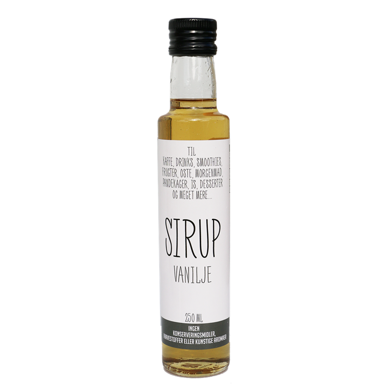 Aztekerne i Mexico brugte vanilje til at fremhæve smagen i chokolade drikke. Denne vaniljesirup er utroligt delikat og med uendelig mange muligheder, hvor kun fantasien sætter grænser for, hvad siruppen kan bruges til. Et par dråber i kaffen, på morgenmadsprodukter, desserter, på lidt frugt eller ost, på is og i drinks. Ligesom vi ikke går på kompromis med smag og konsistens, har vi ingen E-numre eller kunstig farve i siruppen. Siruppen adskiller sig derfor fra mange andre sirupper på markedet. Der tilsættes glukosesirup til sukkeret under produktionen, da glukosesirup sikrer den lækre sirup fra at krystallisere. Sirup er som prikken over i´et og er det søde touch der fremhæver alle de andre gode smage i det du bruger den til. I flaskehalsen sidder et drypstop, således du undgår sirup på flaskens yderside og derved ikke kommer i kontakt med hænderne.