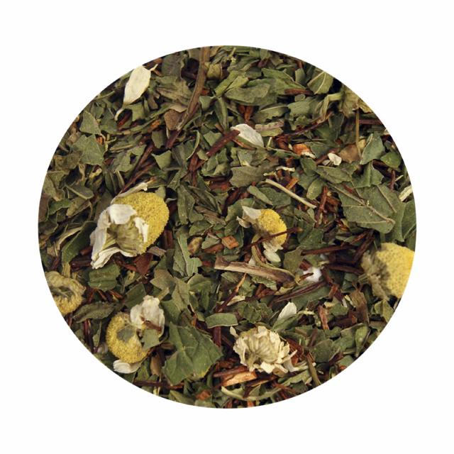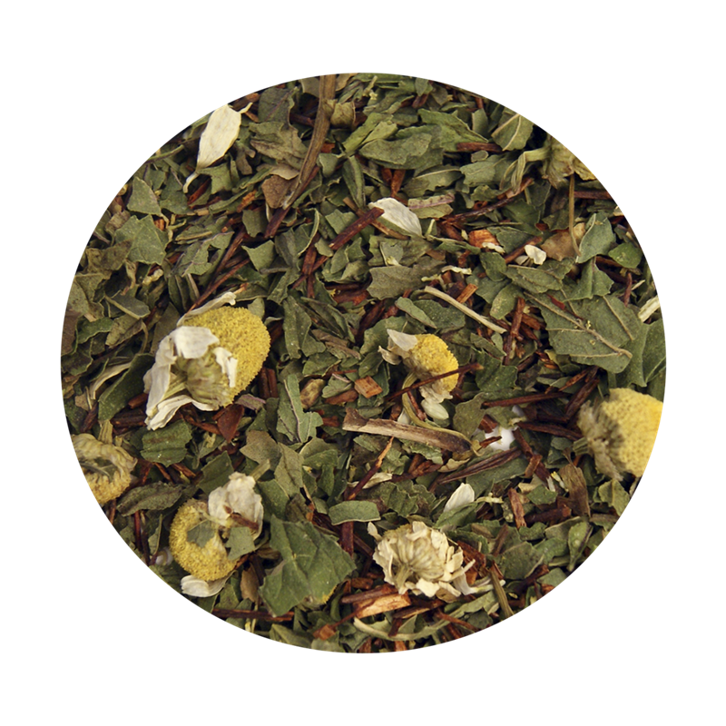 Sydafrikansk rooibush te (40%), pebermynte (40%) og kamilleblomster (20%).