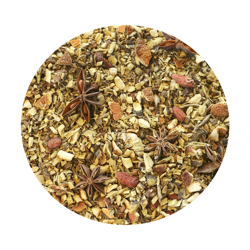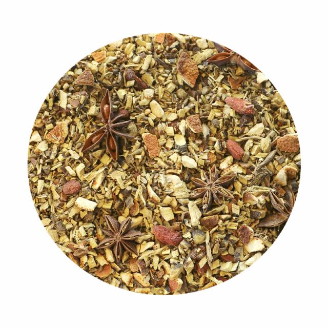 Lakridsrod (48%), aniskerner (15%), orangeskaller (10%), fennikelkerner (7%), hel stjerneanis (6%), kanelstykker (5%), goji bær (5%), chili flager (2%) og naturlig aroma. Indeholder lakrids. Personer, der lider af forhøjet blodtryk, bør undgå for stort indtag.