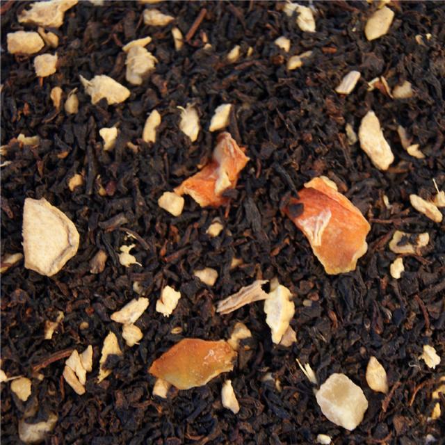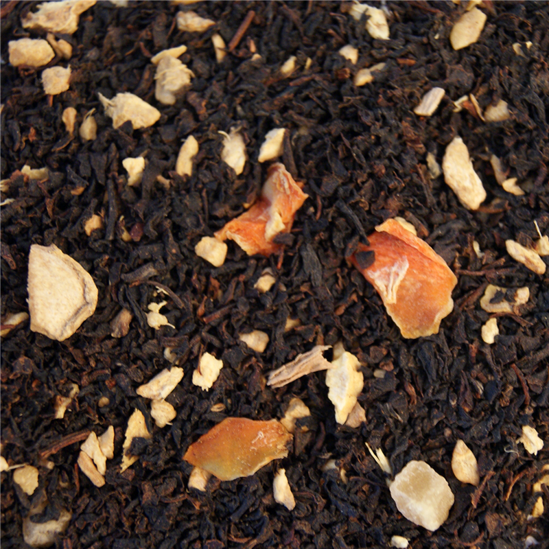 Sorte teer, tørret ingefær (30%), kandiseret ingefær og karotte flager.