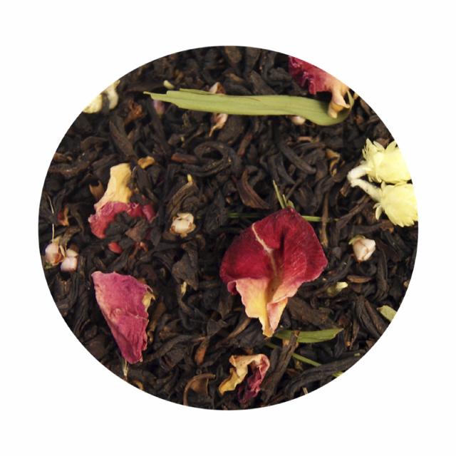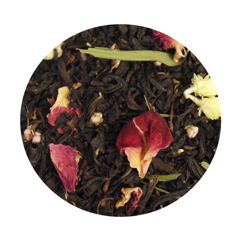 Sort te, rosenblade (2%), kattepoteblomster (1,5%), lyngblomster (1%), birkeblade og aroma.