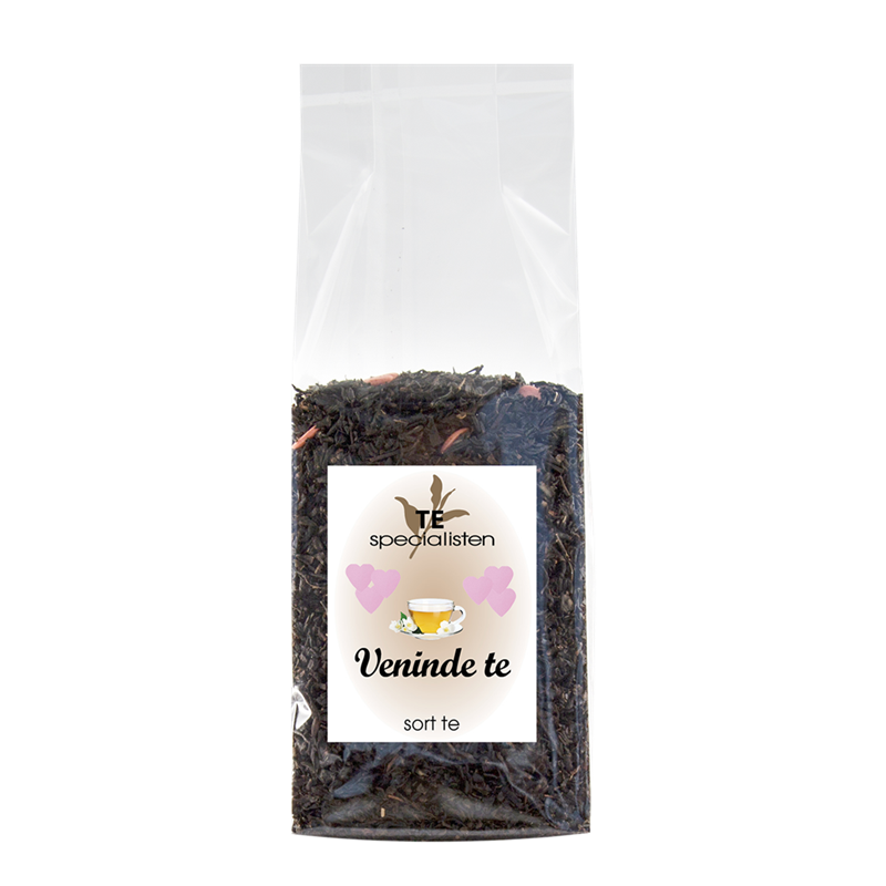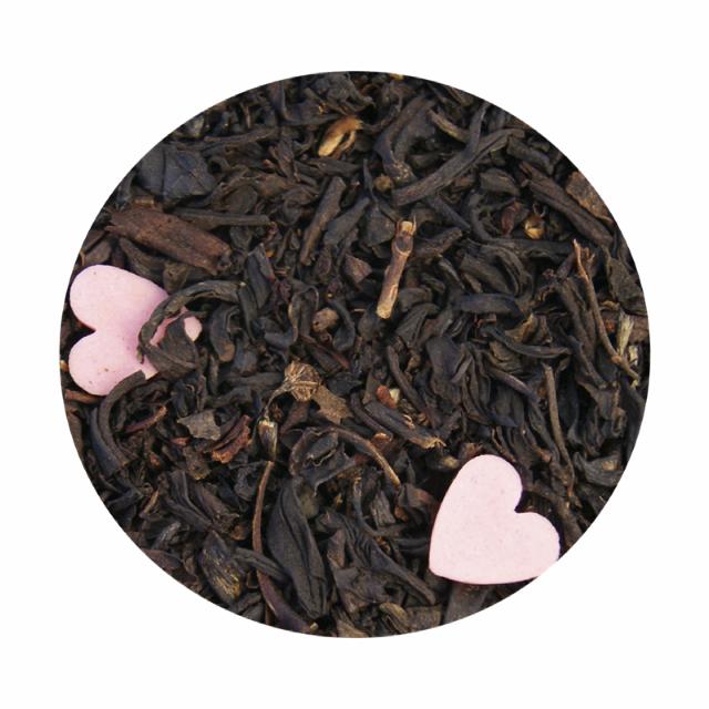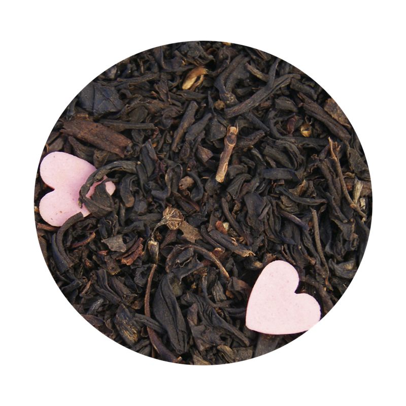 Sort te (94%), sukkerhjerter (sukker, solsikkeolie, kartoffelstivelse, rismel, farve: E120,E101, bærestof: E555, overfladebehandlingsmiddel:E904)(5%) og aroma.