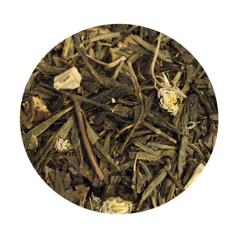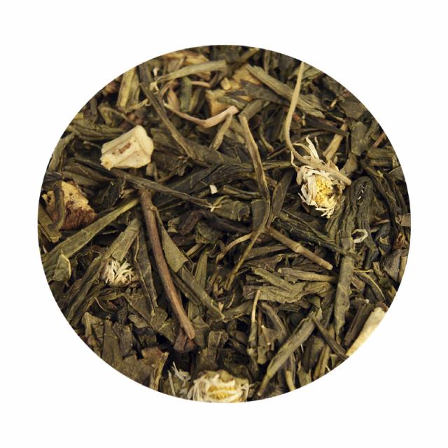 Grøn Sencha te (86%), lakridsrod (10%), bellisblomst (2%) og aroma.