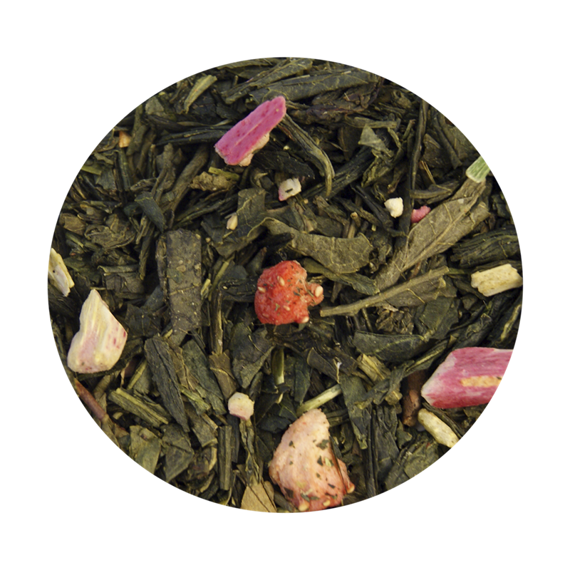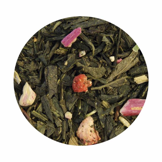 - Fyldig grøn te med god harmoni af jordbær og rabarber.