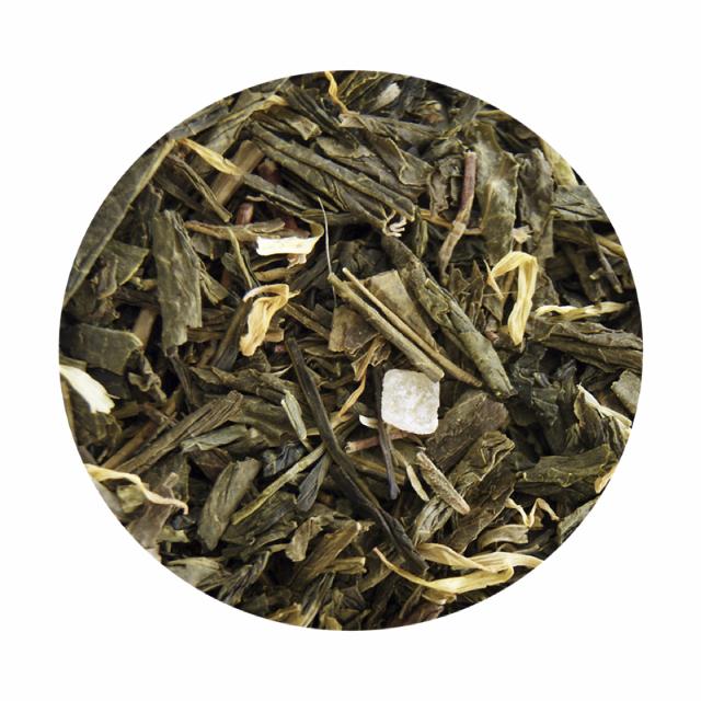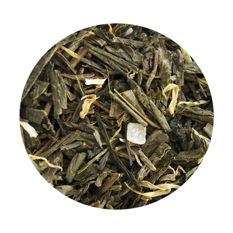 Grøn Sencha te (92%), kandiserede mangostykker (5%) (tørret mango, sukker, konsistensmiddel: E509, surhedsregulerende middel: E330), morgenfrueblomster (1%)og aroma.