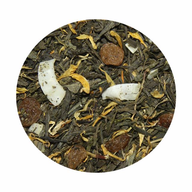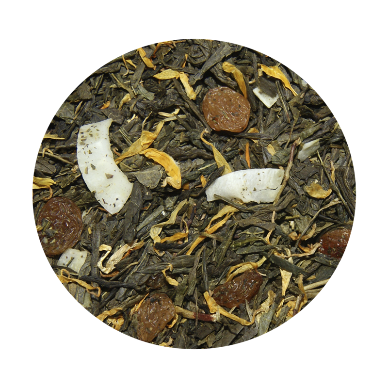 Grøn te (74%), sultans (15%)(sultanas rosiner, bomuldsfrøolie), kokos flager (7%), morgenfrue blomster (1,6%) og aroma