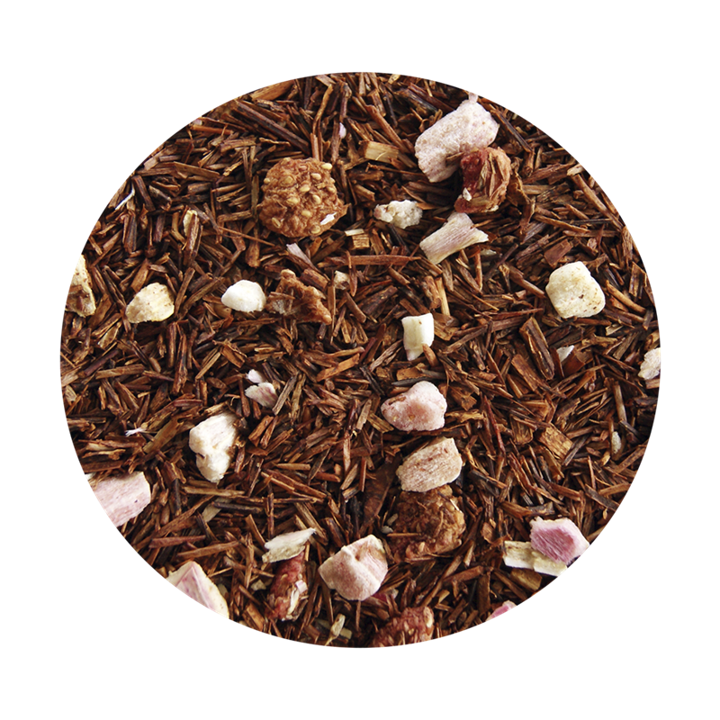 Sydafrikansk rooibush te (96%), frysetørrede jordbærstykker (1%), frysetørrede rabarberstykker (1%) og aroma.