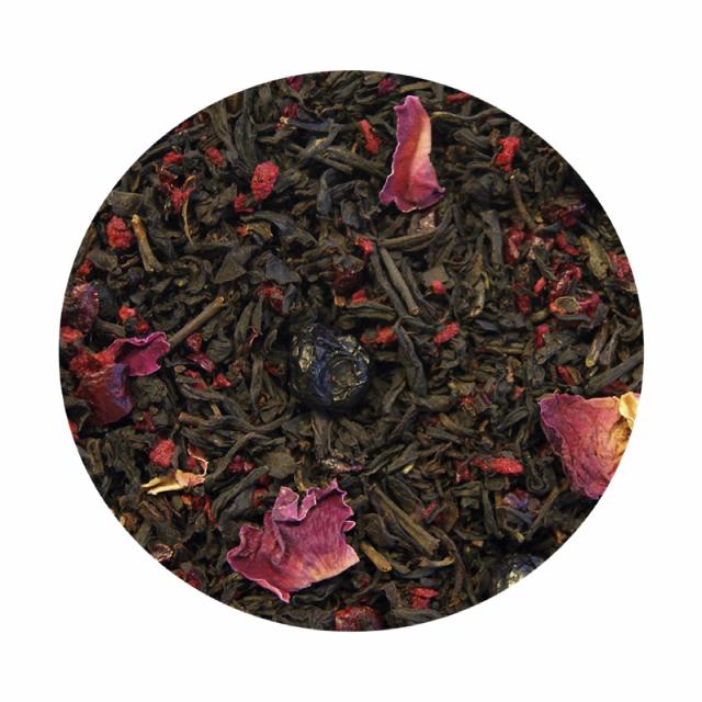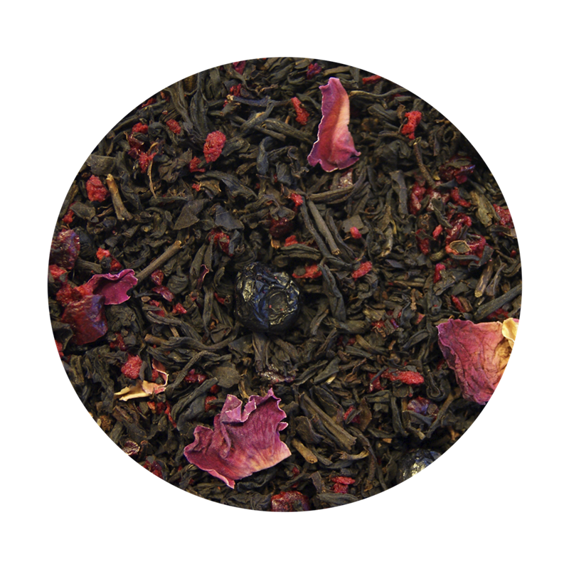 Sort te (89%), rosenblade, frysetørrede kirsebærstykker, frysetørrede blåbær og aroma.