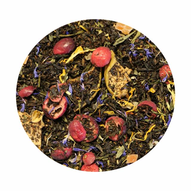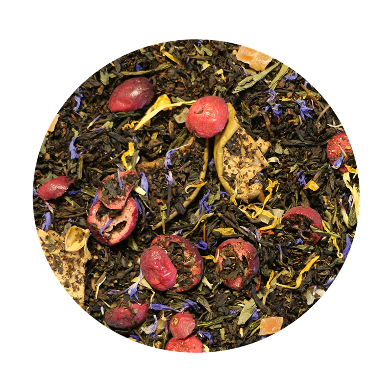 Sort te (69%), grøn te (12%), papayastykker (tørret papaya, rørsukker, konsistensmiddel: E509, surhedsregulerende middel: E330), tørret æble, frysetørrede tranebær, frysetørrede kiwistykker, kornblomster, morgenfrueblomster og aroma.