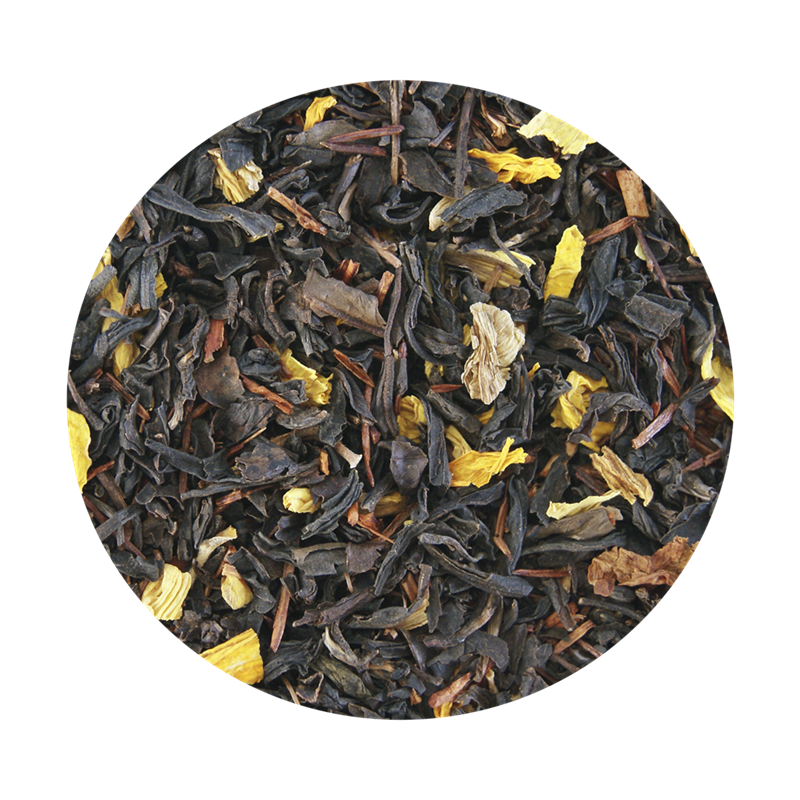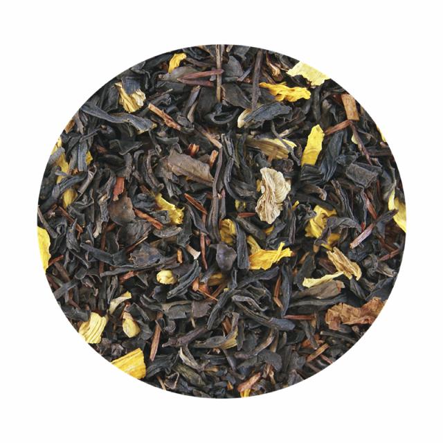 Sort te (42%), Rooibush te (57%), solsikkeblomster (0,6%) og aroma