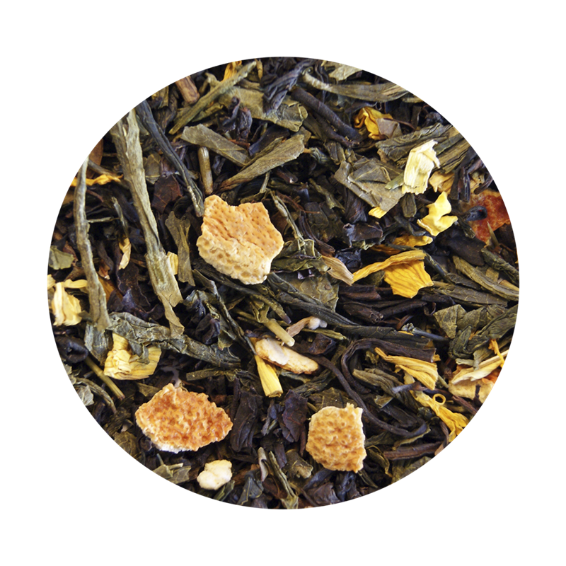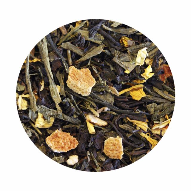 Sort te (45%), grøn te (45%), orangeskaller (7%), solsikkeblomst (1,7) og aroma.