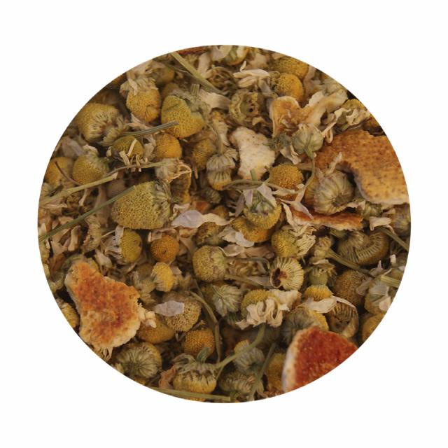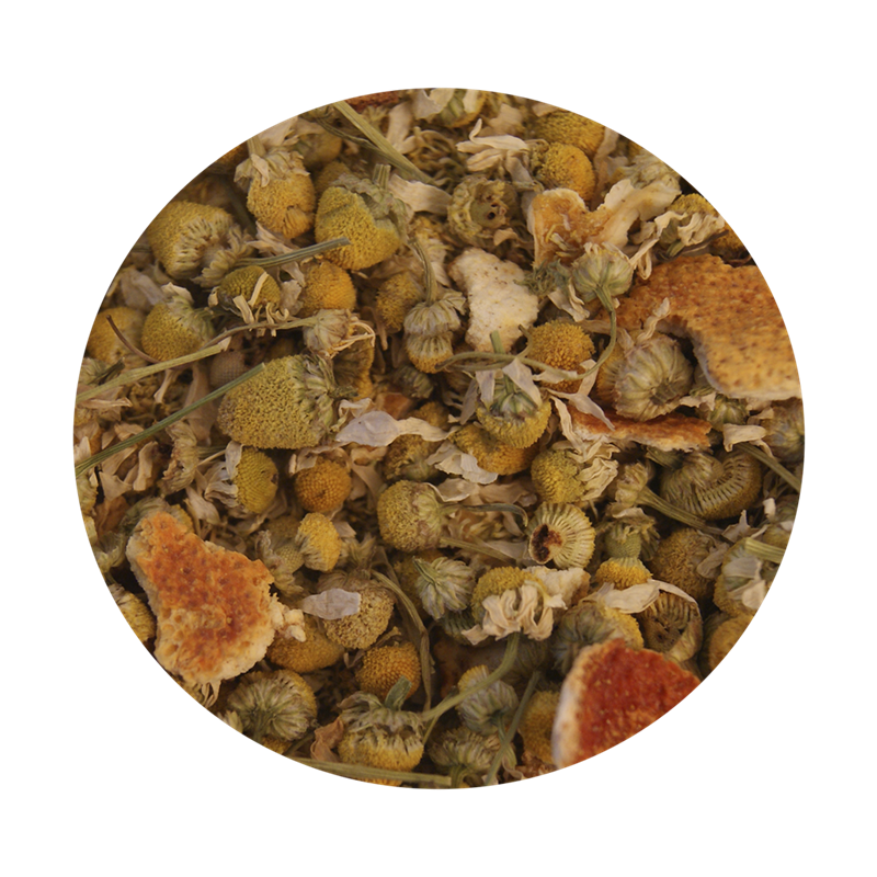 Kamilleblomster (86%), orangeskaller (10%) og aroma.