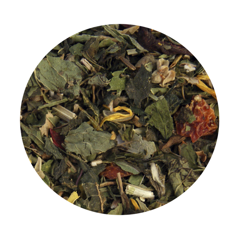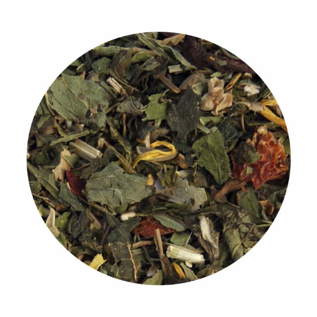Pebermynte (15%), brændenælde (11%), hybenskal (11%), citronmelisse (9%), marokkansk mynte (9%), lindeblomster (9%), hibiscusblomster (7%), jernurt (6%), padderokke (5%), lakridsrod (5%), fennikelkerner (3,5%), aniskerner (3,5%) og morgenfruer (1%).