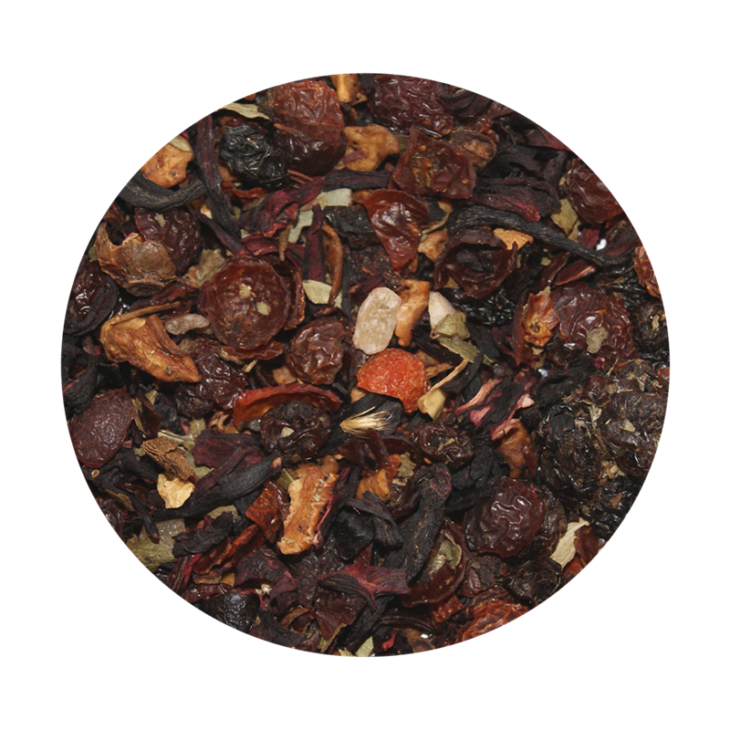 Hybenskaller (35%), hibiscusblomster (20%), korender (korender, solsikkeolie) (17%), tørrede æblestykker (14%), kandiserede ananasstykker (7%) (tørret ananas, sukker, surhedsregulerende middel: E330), frysetørrede solbær (3%), jordbærblade (2%) og aroma.
