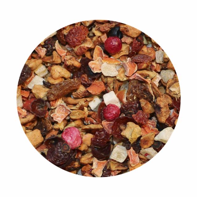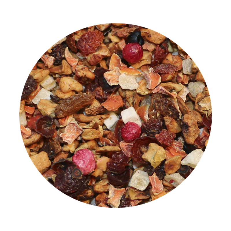 Tørret æble(45%), karotte flakes, hybenskal(10%), kandiserede mangostykker(mango, sukker, konsistensmiddel:calciumchlorid, surhedsregulerende middel: citronsyre), kandiseret melon(Cantaloupemelon, sukker, surhedsregulerende middel:citronsyre, aroma), sultanas(sultanas, bomuldskerneolie), frysetørrede ribs, aroma, frysetørrede solbær